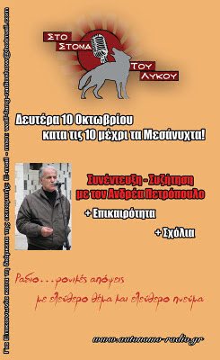 Τη Δευτέρα 10 Οκτωβρίου 2011, στα πλαίσια μιας αξιόλογης προσπάθειας διαδικτυακού ραδιοφώνου, στην εκπομπή "Στο στόμα του λύκου", παρουσιάστηκε μια συνέντευξη του ελληνοκράτη εθνικιστή Ανδρέα Πετρόπουλου. Τη συνέντευξη μπορείτε να την ακούσετε σε μαγνητοσκόπηση εδώ.